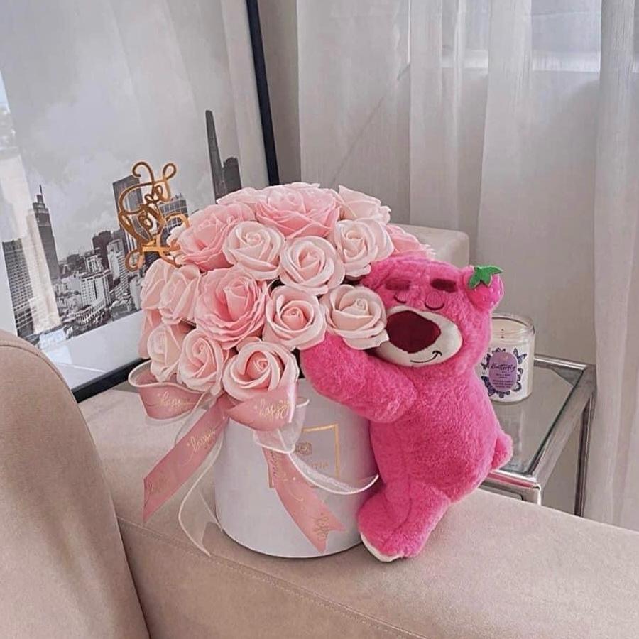 Exclusivo arreglo de rosas rosadas en una box redonda, acompañado de un tierno peluche. Un regalo sofisticado y lleno de cariño.