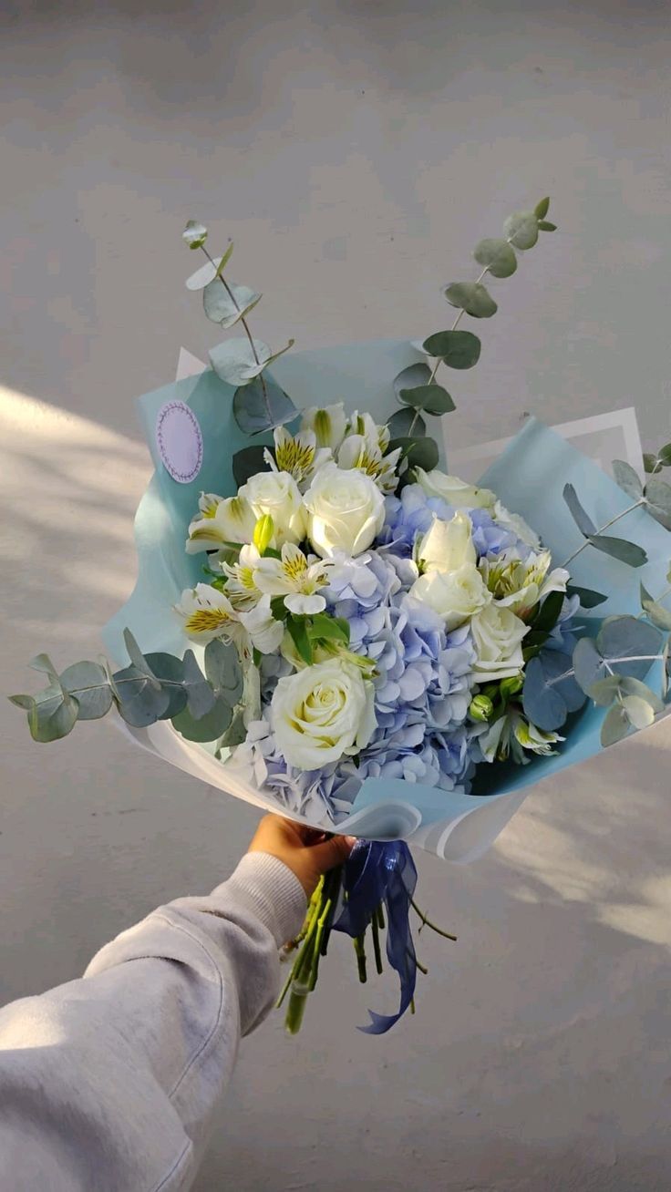 Un arreglo elegante y luminoso que combina hortensias celestes, rosas blancas y alstroemerias amarillas, creando una mezcla fresca, suave y armónica. El follaje verde y la envoltura en tonos azules aportan un acabado moderno y delicado, ideal para quienes buscan un detalle lleno de paz y belleza.