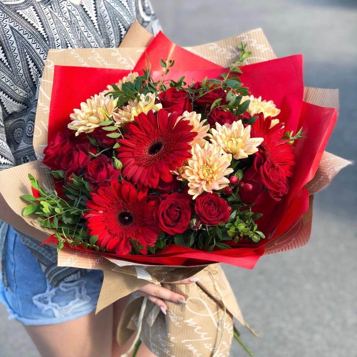 Ramo fresco y vibrante con rosas rojas y gerberas, una combinación llamativa para regalar en cualquier celebración especial.