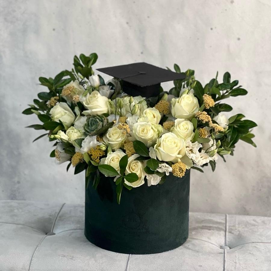Caja negra con elegantes rosas blancas y verdes, decorada con birrete de graduación.