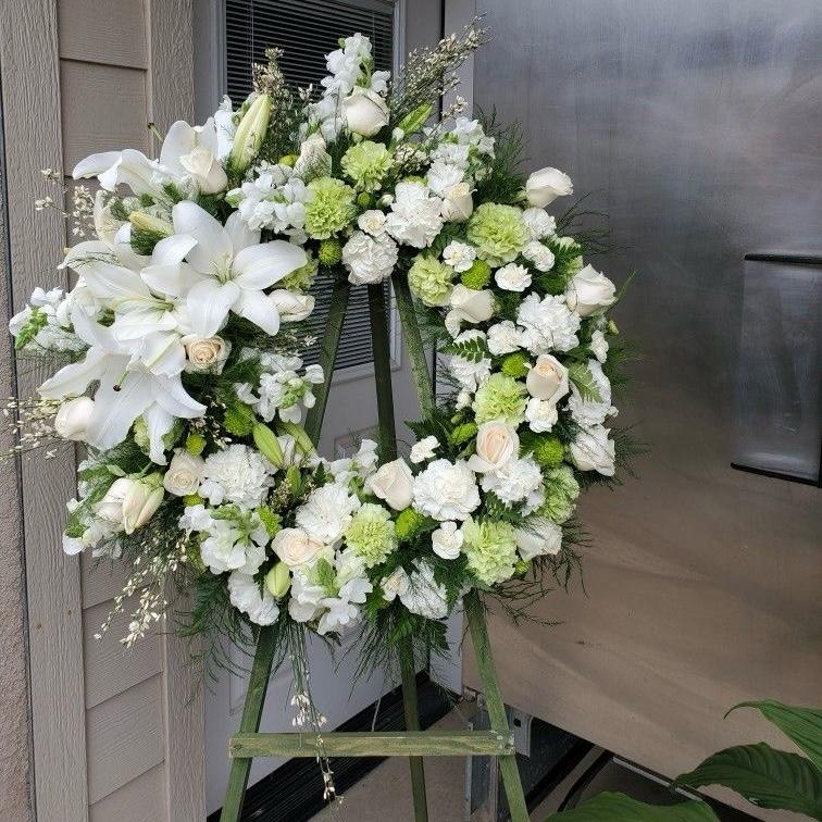 Corona floral en tonos blancos y verdes para expresar respeto y serenidad.