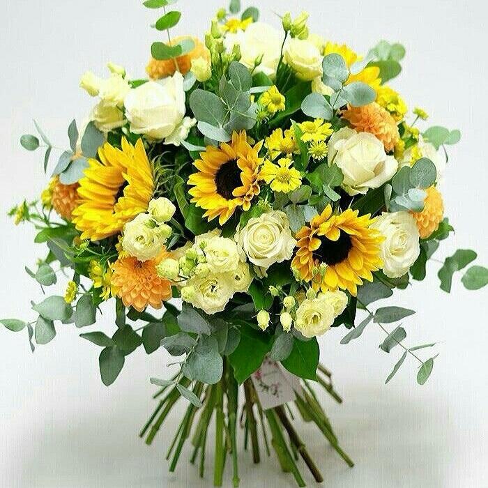 Elegante ramo con girasoles, rosas blancas y verdes, en estilo natural.