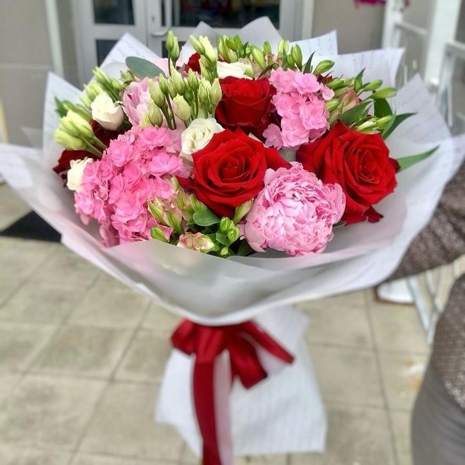 Bouquet colorido con rosas rojas y claveles rosados, lleno de frescura y alegría.