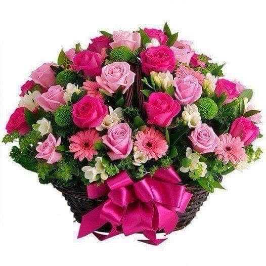 Canasta premium de rosas rosadas y gerberas con lazo decorativo.