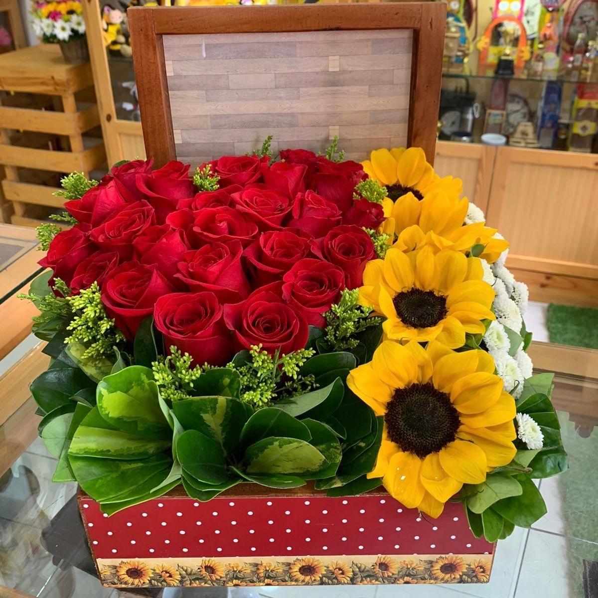 Caja floral con rosas rojas y girasoles.