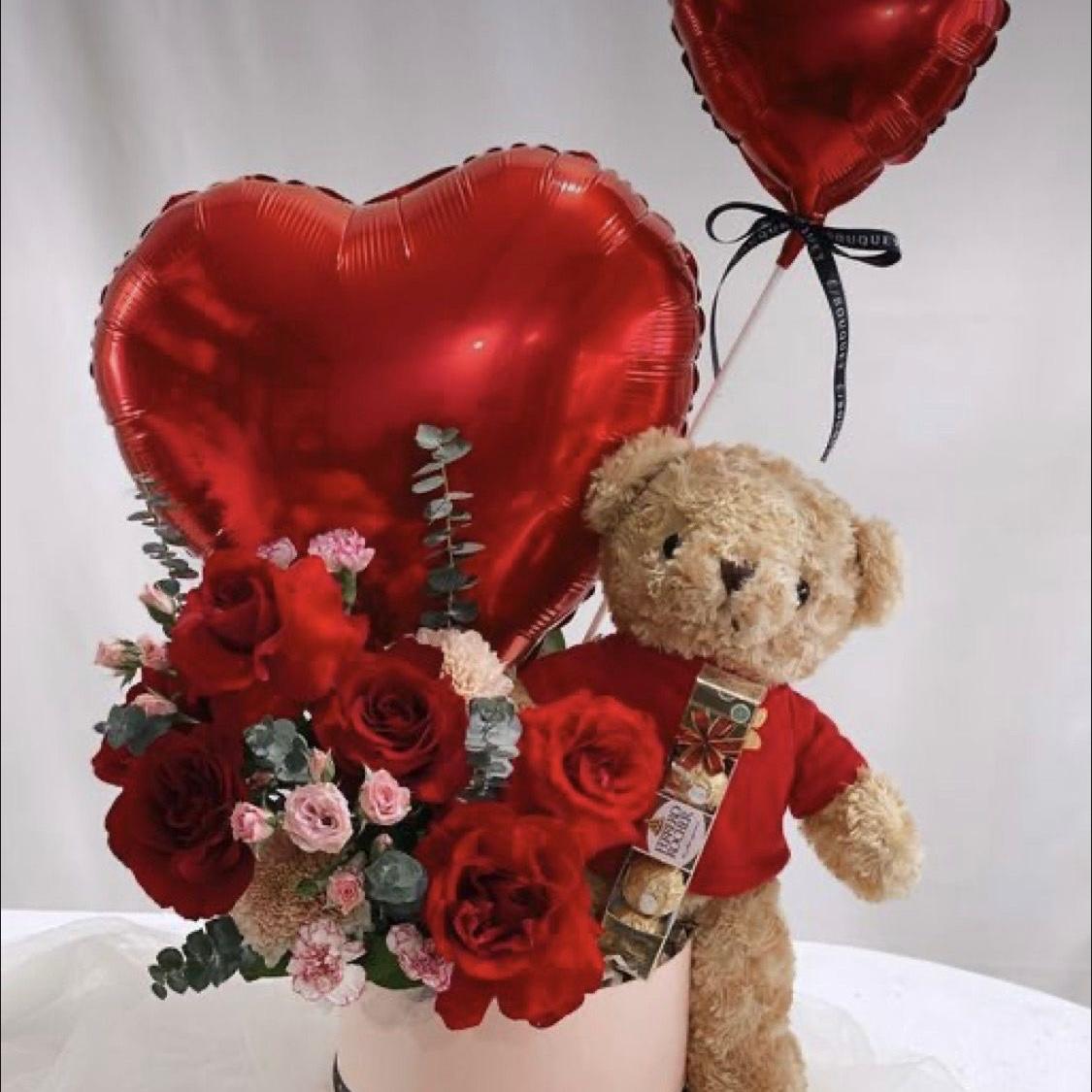 Arreglo romántico con rosas rojas acompañado de un peluche y globos metálicos en forma de corazón, ideal para ocasiones especiales.