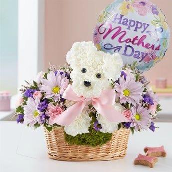 Canasta con osito floral blanco rodeado de flores lilas y rosadas. Incluye un globo “Happy Mother’s Day”, ideal para regalar en el Día de la Madre.