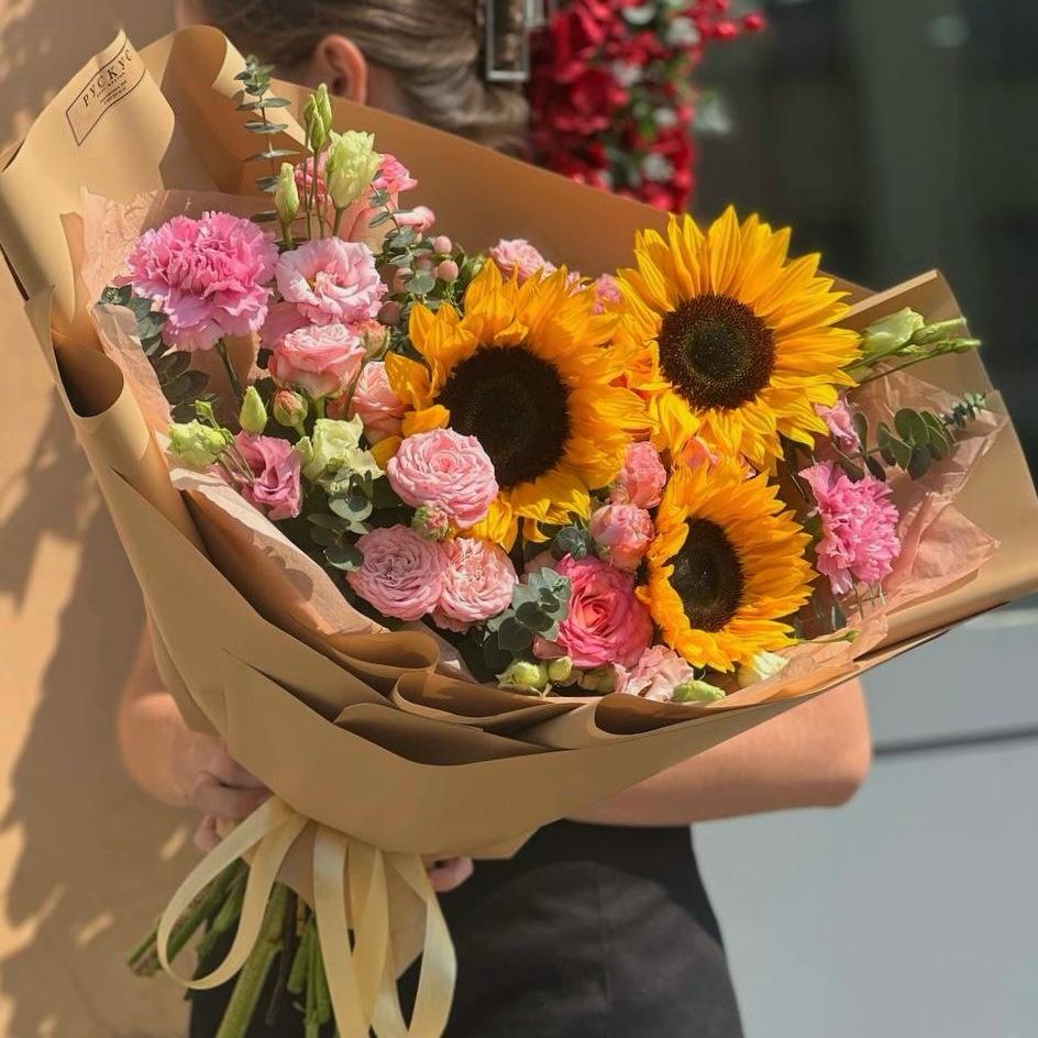 Arreglo moderno con girasoles y flores rosadas, ideal para regalar.