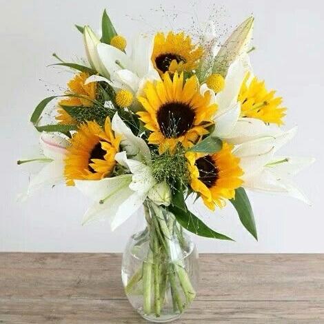 Hermoso ramo de girasoles y lirios blancos en un jarrón de vidrio.