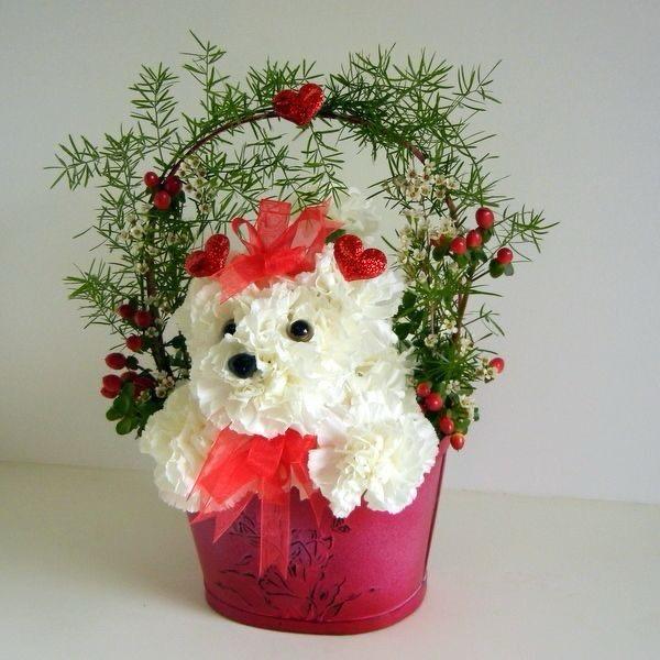 Perrito floral en maceta roja, adornado con un arco decorativo y flores pequeñas. Un detalle sencillo y encantador para regalar en cualquier ocasión.