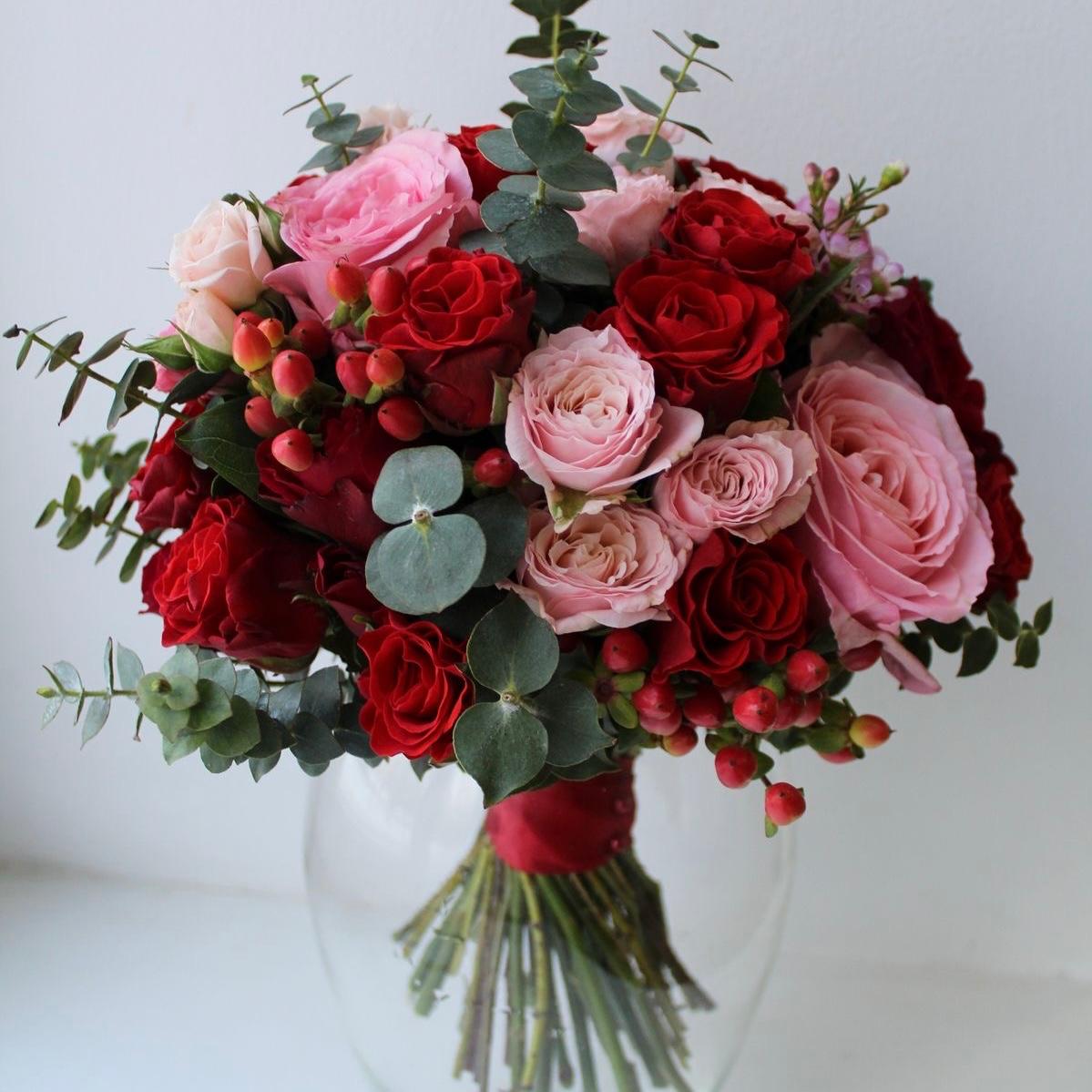 Elegante ramo de rosas rojas y rosadas acompañado de follaje verde, diseñado para destacar en cualquier ocasión especial.