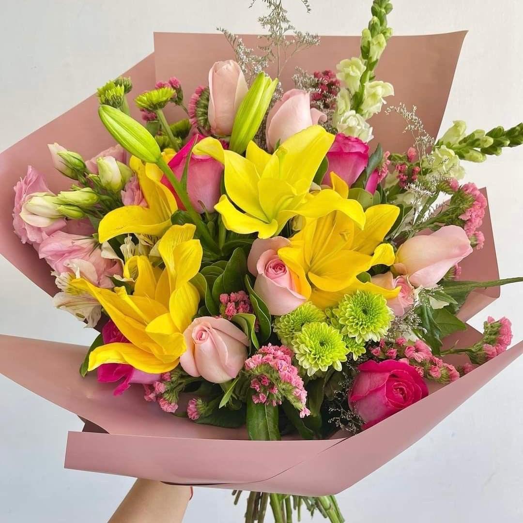 Bouquet con lirios amarillos, rosas y flores mixtas en tonos vibrantes.