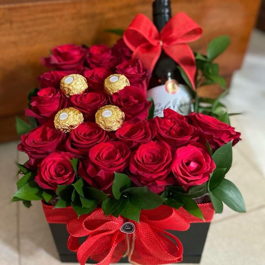 Elegante box de rosas rojas acompañado de chocolates Ferrero y una botella decorativa, perfecto para un regalo sofisticado y romántico.