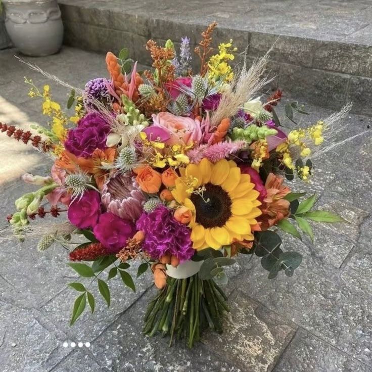 Arreglo elegante con girasoles, rosas y flores exóticas.
