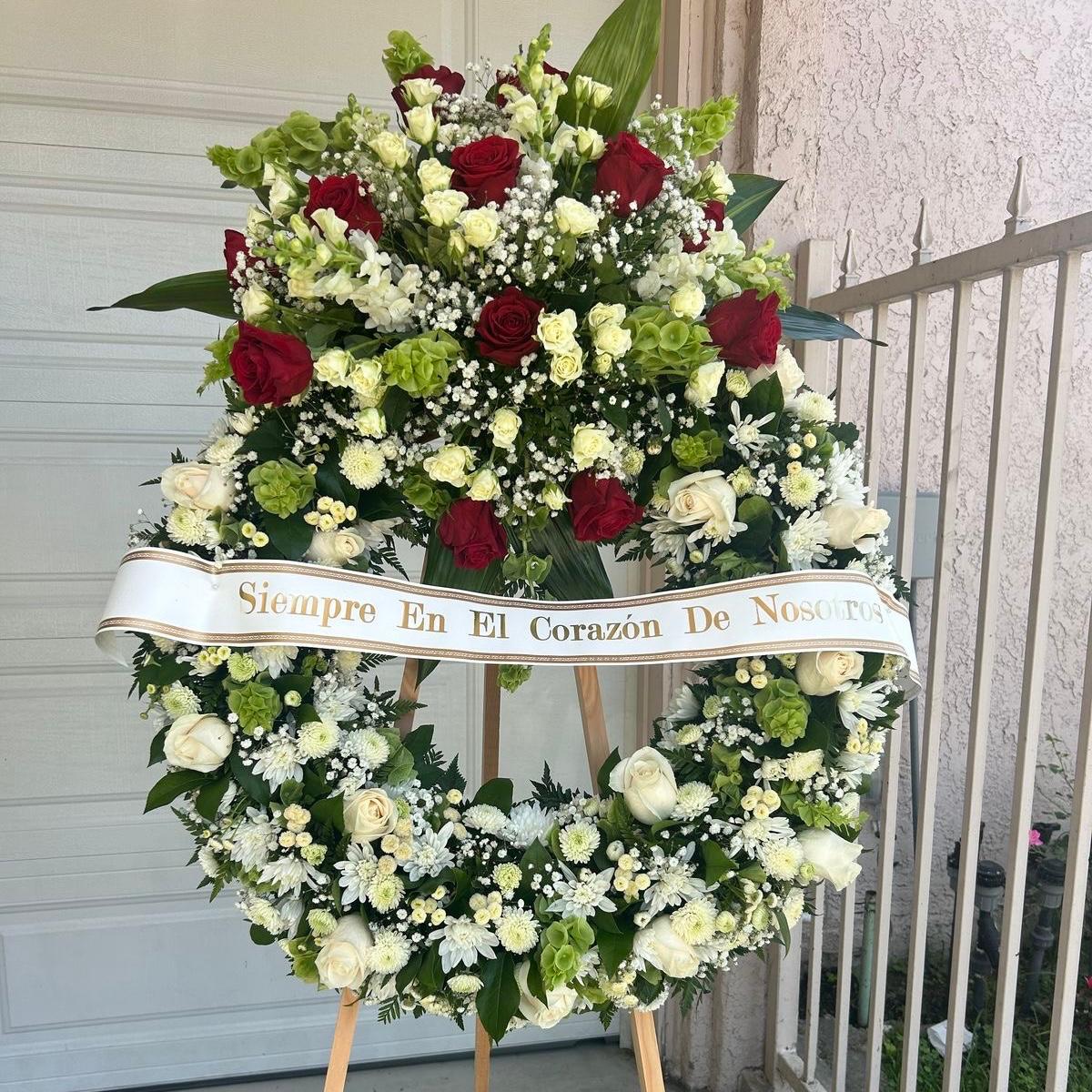 Corona con rosas rojas y flores blancas que simbolizan amor y recuerdo eterno.