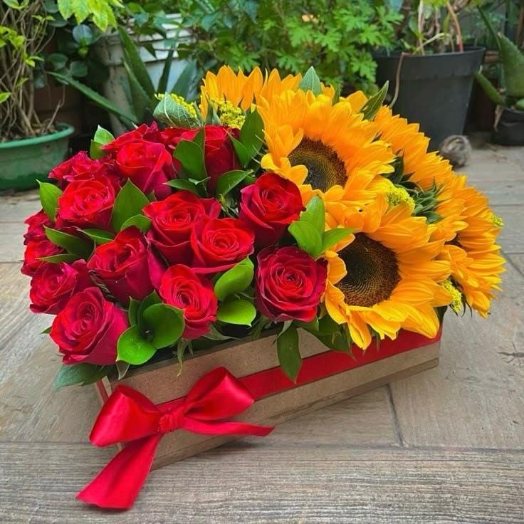 Caja decorativa con rosas rojas y girasoles amarillos, adornada con un lazo rojo. Un regalo perfecto para sorprender con estilo.
