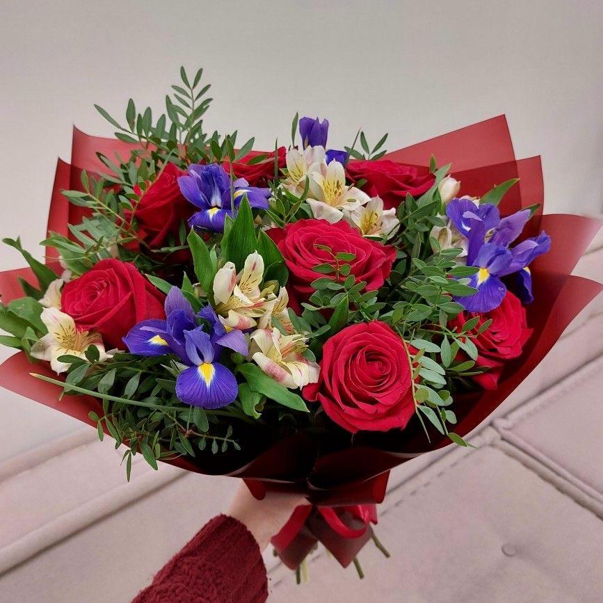 Colorido ramo con rosas rojas, lirios azules y flores blancas, una combinación alegre y fresca para todo tipo de celebraciones.
