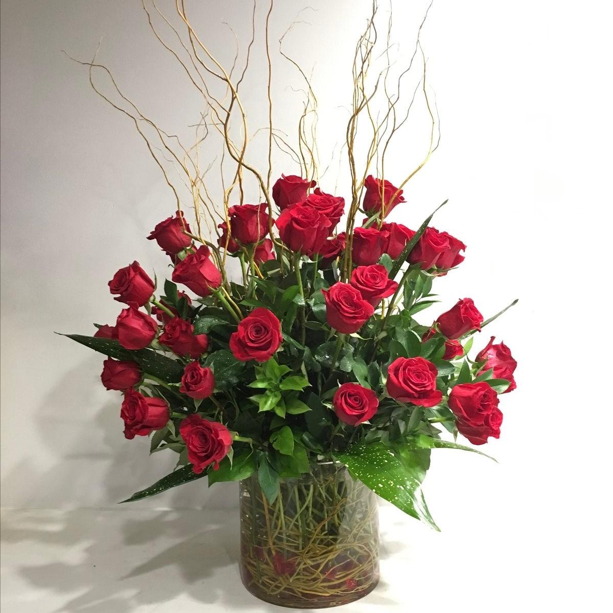 Imponente arreglo de rosas rojas en jarrón con ramas decorativas, perfecto para ocasiones formales o regalos que transmiten elegancia.