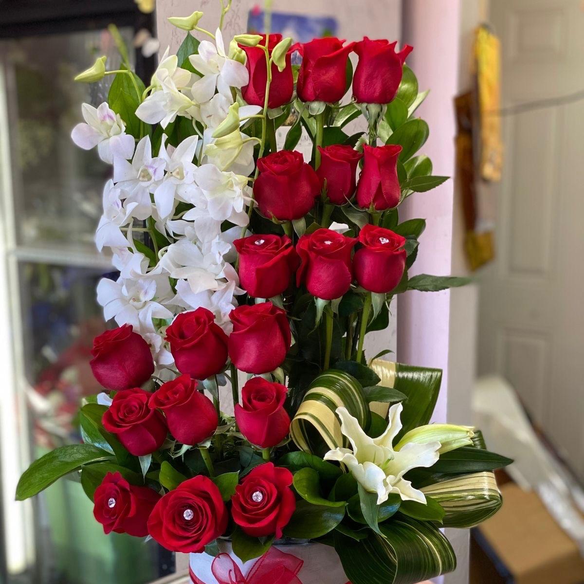 Impactante arreglo con rosas rojas y flores blancas en un estilo vertical. Perfecto para expresar amor y pasión.