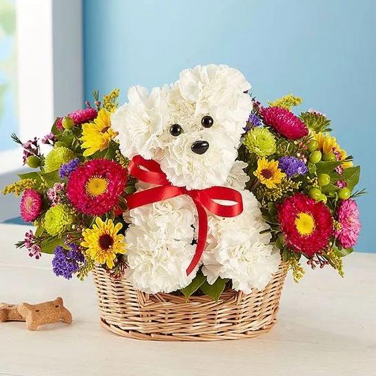 Arreglo floral en canasta con osito blanco hecho de flores acompañado de un mix de flores coloridas de temporada.