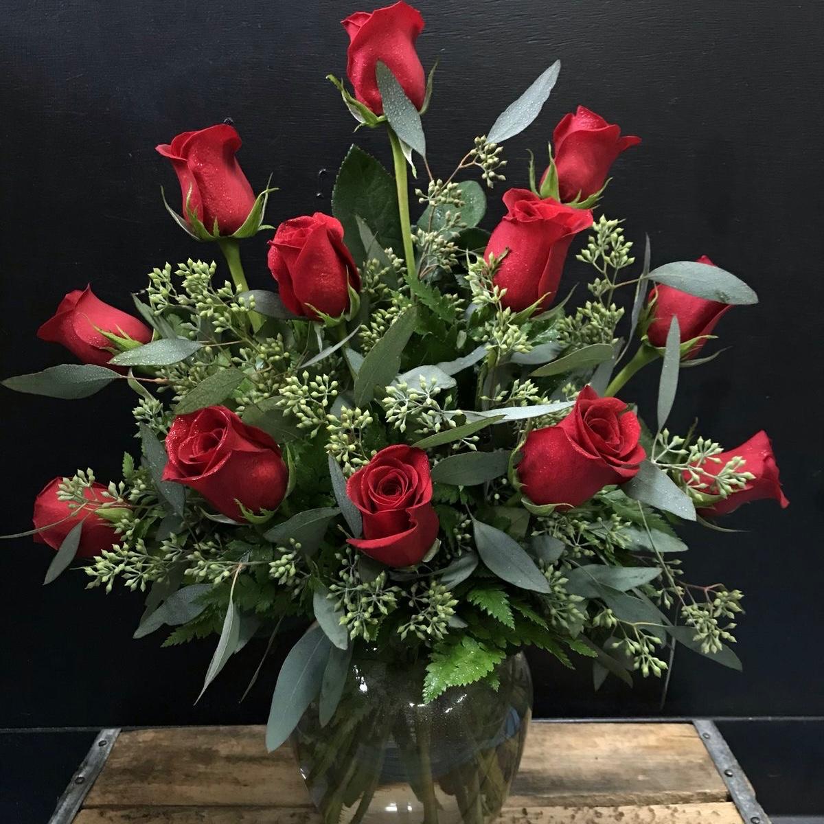 Clásico ramo de rosas rojas frescas en jarrón de cristal, acompañado de follaje verde, ideal para transmitir amor y elegancia.