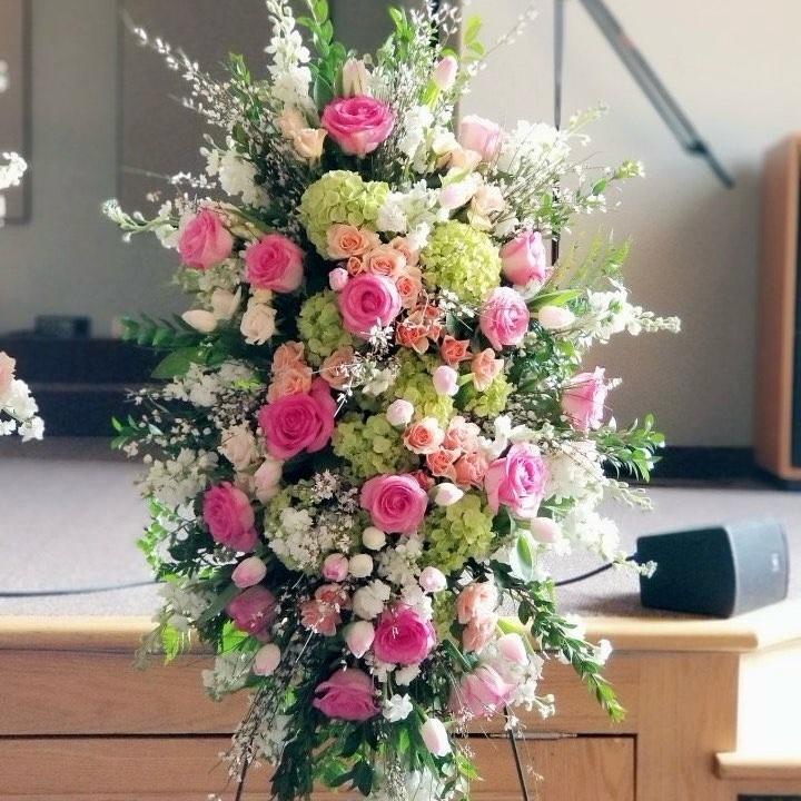 Arreglo floral vertical con rosas rosas y flores blancas, transmitiendo serenidad y esperanza.