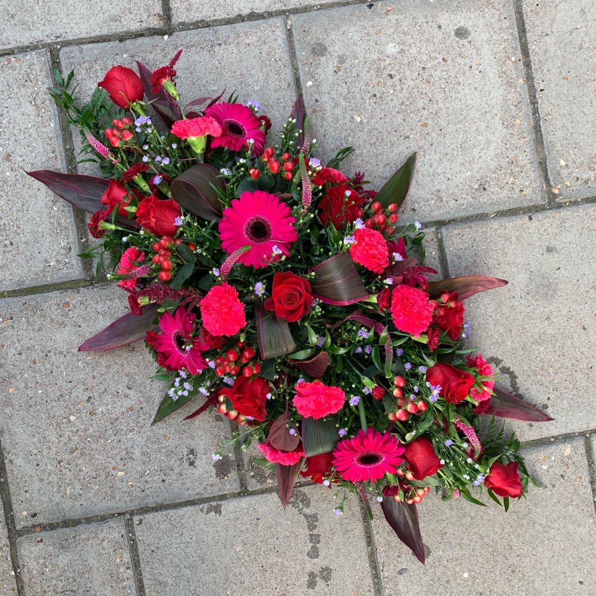 Arreglo floral fúnebre en tonos rojos intensos con gerberas, claveles y rosas, simbolizando amor y despedida.