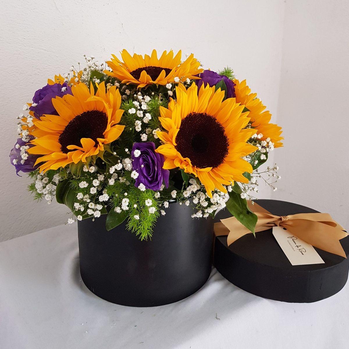 Caja negra decorada con girasoles vibrantes, gypsophila y flores lilas que realzan su contraste.