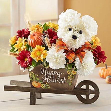 Arreglo floral con osito blanco en carretilla decorativa, rodeado de flores de tonos otoñales y calabazas. Ideal para regalar en celebraciones especiales.