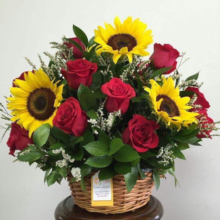 Canasta floral con una combinación de girasoles amarillos y rosas rojas, decorada con follaje verde. Un detalle alegre y elegante.